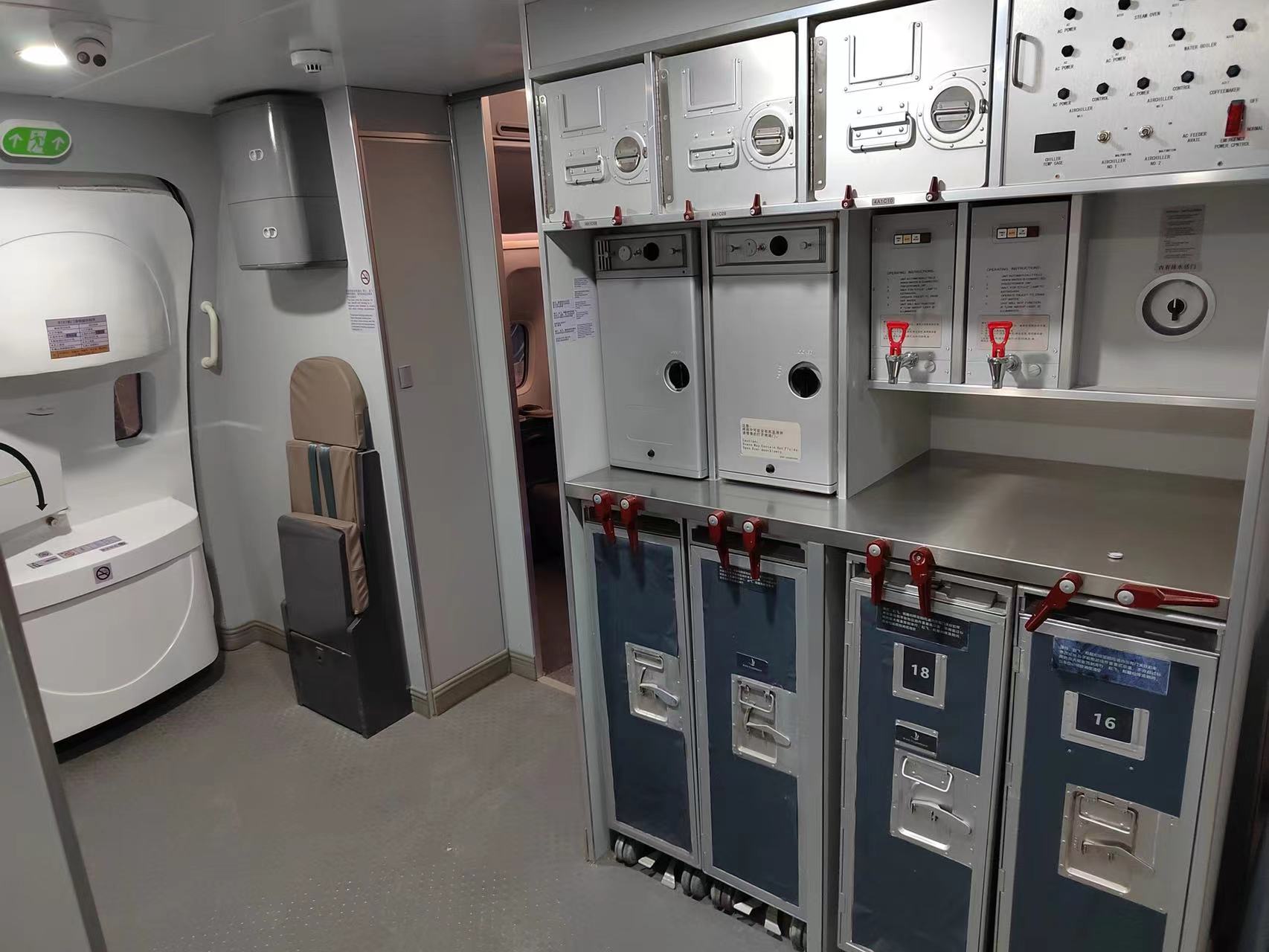 廚房均用符合材料制成,即防火、環(huán)保,又具有極高仿真效果。廚房的外形、插件位置的配置均與真實飛機的廚房一致。廚房上的各種標(biāo)簽和圖標(biāo)等,均是仿真制造和安裝的。